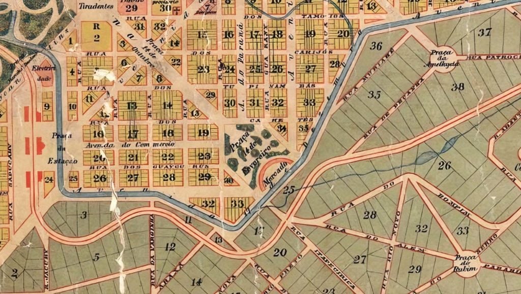 Detalhe da planta de BH elaborada em 1895 por Aarão Reis, mostrando, ao centro, a Praça 14 de Fevereiro (posterior Rio Branco) com a indicação do Mercado. (Crédito: Acervo da CCNC).