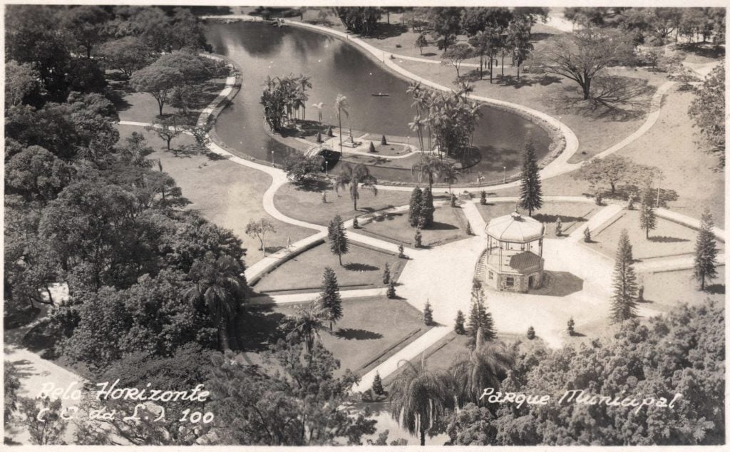 Foto antiga do Parque Municipal. O coreto que ficava nas proximidades do “velho” Mercado Municipal foi transferido para o parque em 1926. (Crédito: Arquivo Público Mineiro / s.d.).