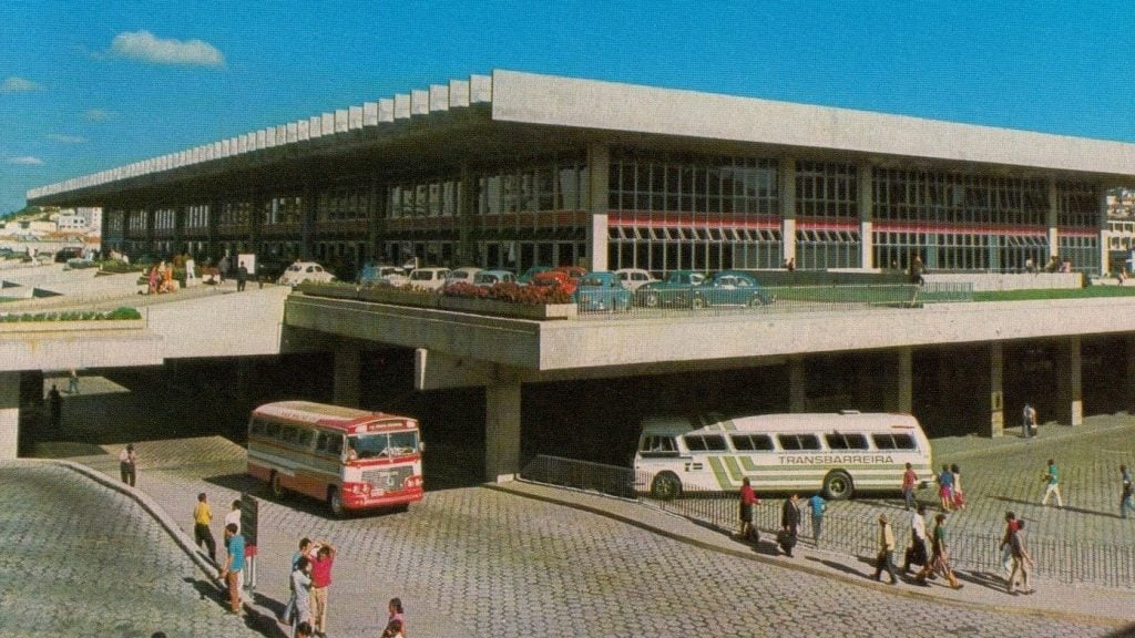 O Terminal Rodoviário Governador Israel Pinheiro, inaugurado em 1971 e projetado pela arquiteta Suzy de Mello e equipe, tornou-se patrimônio cultural do município em 1994. (Crédito: Cartão-postal, anos 1970 / Reprodução).
